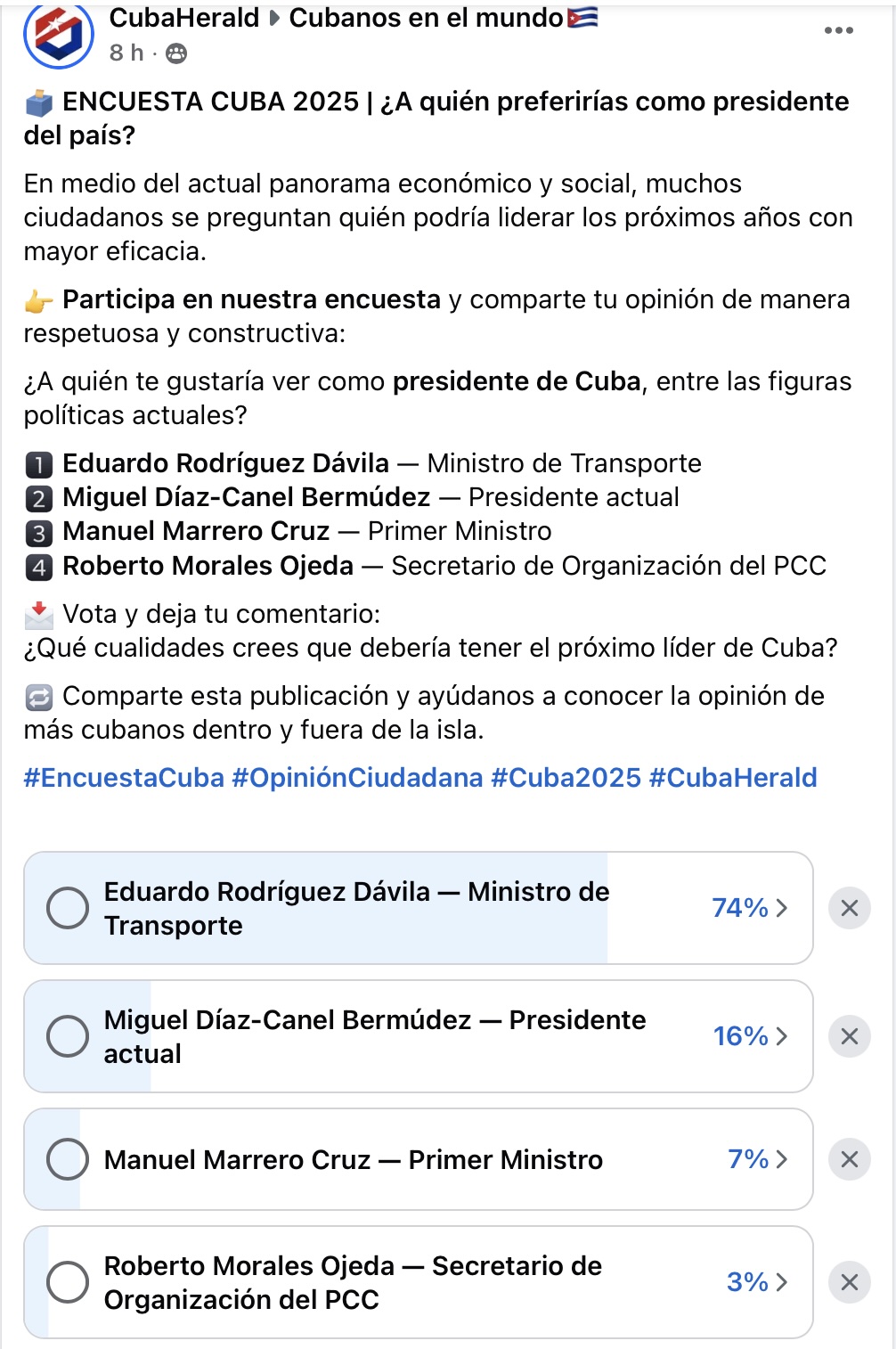 La encuesta, difundida en grupos como Cubanos en el Mundo y CubaHerald Noticias, tuvo un alto nivel de interacción y comentarios de cubanos residentes tanto en el país como en el exterior, que destacaron la necesidad de un liderazgo “más técnico y eficiente” en el contexto actual.