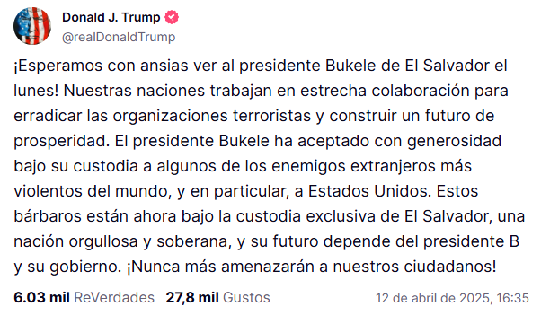 Desde su red social Truth Social, Trump manifestó su expectativa ante la reunión, destacando el papel de Bukele en la detención de individuos considerados altamente peligrosos. Según el mandatario estadounidense, El Salvador ha asumido la custodia de personas vinculadas a estructuras delictivas transnacionales, con el objetivo de evitar futuras amenazas en suelo norteamericano.